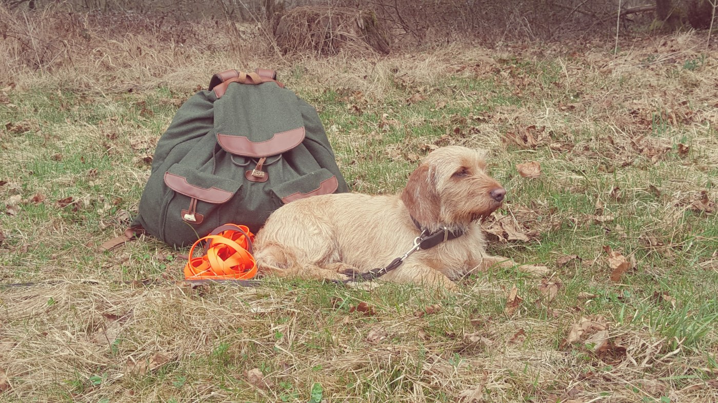 Das erste MAL haben wir das Zusatz Prüfungsfach Ablegen mit Schuss trainiert. Für den ersten Versuch war das wirklich ganz gut. 15 Minuten am Rucksack abgelegt, ein Schuss und dann nochmal 5 Minuten Ruhe… Der Hund darf sich nicht wegbewegen. Ohne Riemen haben wir uns das noch nicht getraut, war doch über dem Bächlein eine Alpakka und Truthahn Farm – Vertrauen ist gut – Kontrolle ist besser 😉