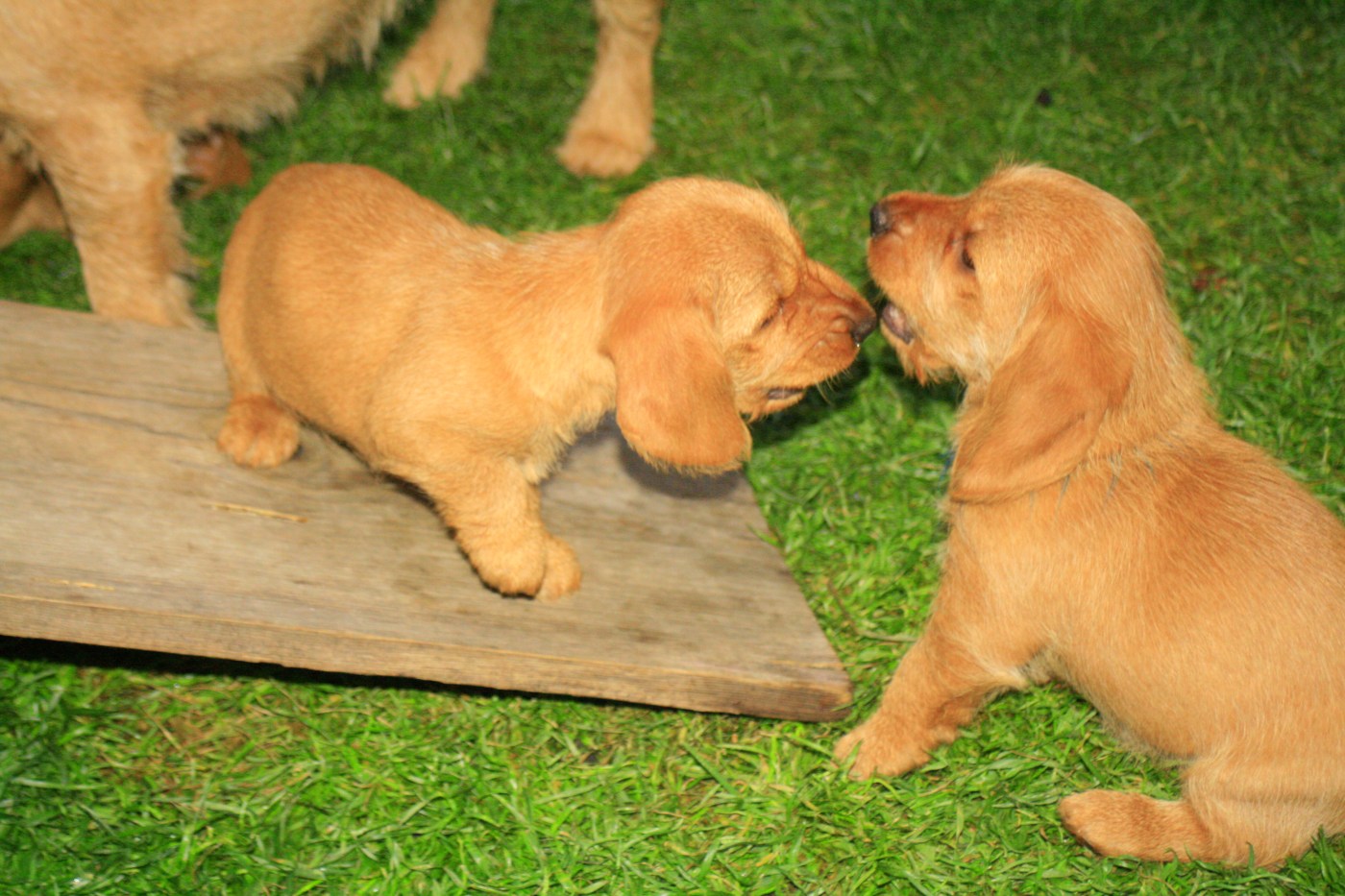 Verschiedene Welpenbesucher sind nun fast täglich bei uns, um ihre neuen Mitbewohner kennen zu lernen. Das bedeutet viel Spaß für die Welpen, die jede Menge neuer Schuhbänder beknabbern können!