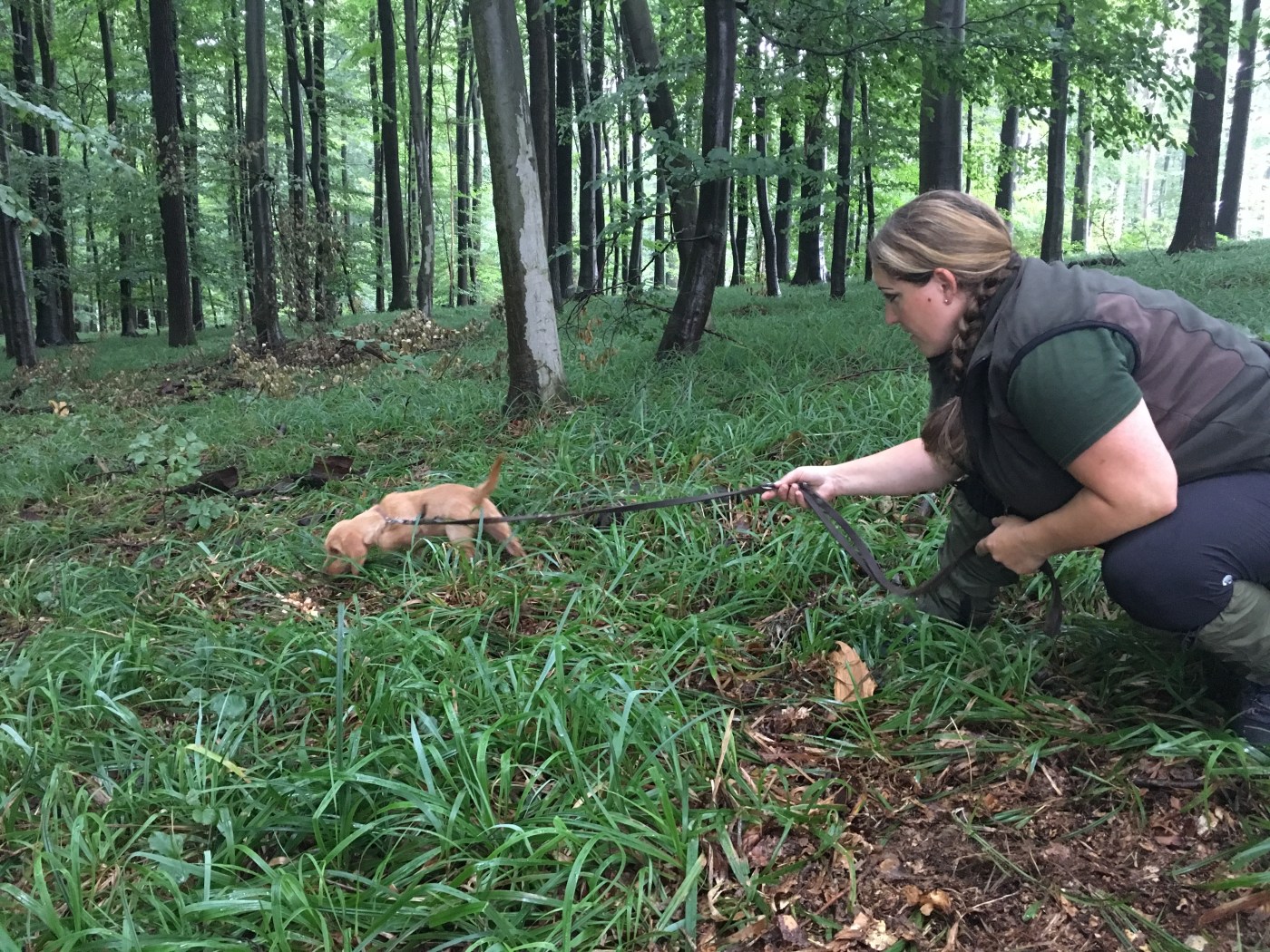 … darum verbringen wir im Herbst soviel Zeit wie möglich im Revier und trainieren mit unseren Hunden auf der künstlichen Schweißfährte. Auch die Junghündin Claire ist schon fleißig bei der Sache.