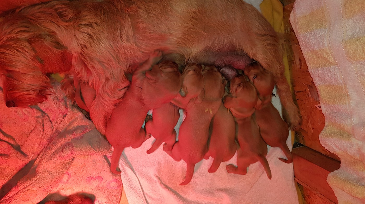 Die Mutter geht nun nur in die Wurfbox zum Säugen, wenn IHR danach ist. Es geben nicht mehr die Welpen den Ton an wann Fütterungszeit ist. Jalinaar ist auch immer noch ganz sauber und räumt brav hinter den Welpen auf. Man merkt kaum, dass hinten auch öfter mal was raus kommt!