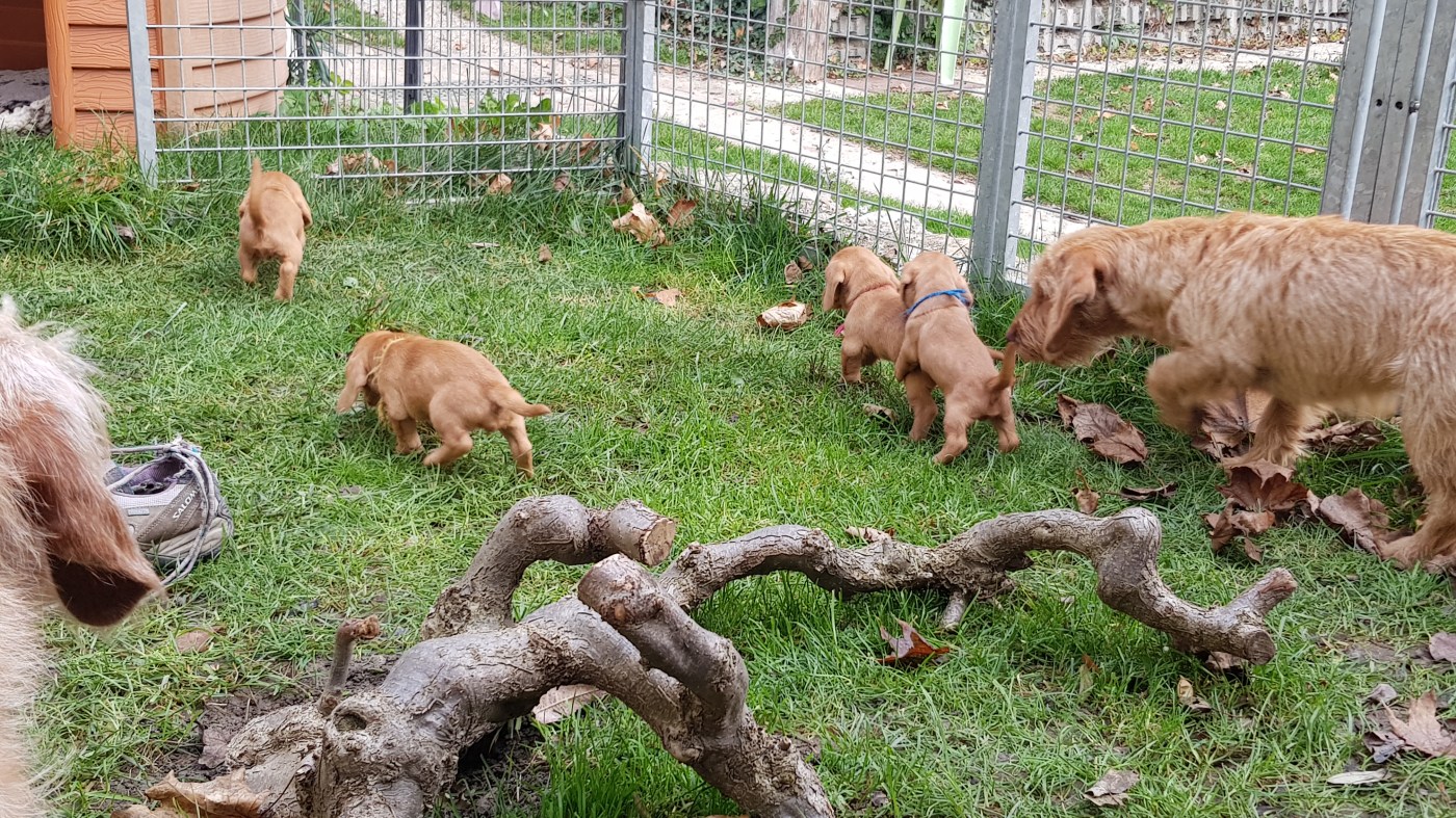 Woche 5 steht ganz im Zeichen von Spiel und Spaß. Die Welpen können nun untertags selbständig rein und raus gehen und den Garten erkunden. Wenn ihnen kalt ist gehen sie seblständig wieder ins Haus und wenn sie lösen müssen, dann gehen sie in ihre „Zone“. Im Haus wird nur mehr in der Nacht gelöst, wenn sie eingesperrt sind.