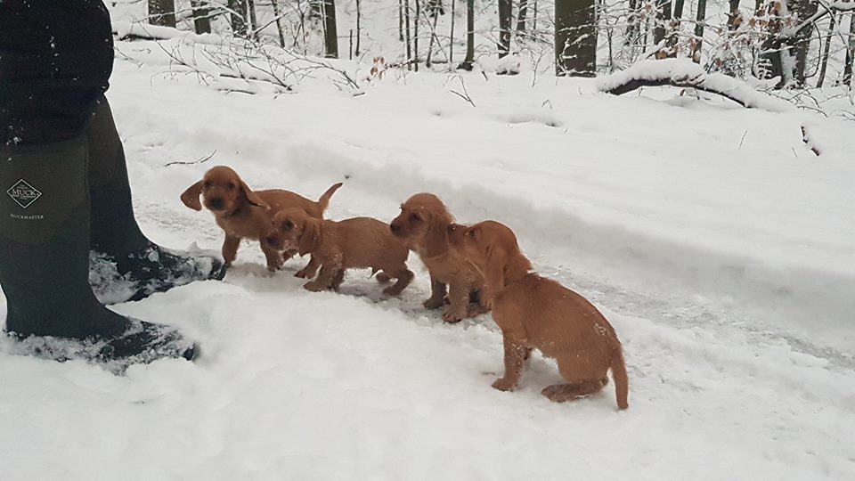 Wir gewöhnen die Welpen weiterhin an Wild und unternehmen die ersten Ausflüge ins Revier. Das macht mörder Spaß und einige sind auch gleich an jeder Fährte dran. Autofahren ist noch so eine Sache, aber es geht jeden Tag besser. Am Riemen laufen mögen wir gar nicht … aber auch an das werden wir uns noch gewöhnen.
