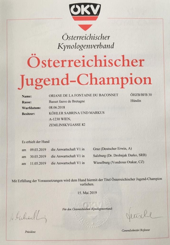 Oriane de la Fontaine du Baconnet – Jugendklasse – exc1, Jugendbester, Beste Hündin, BOB, 5. Gruppe VI