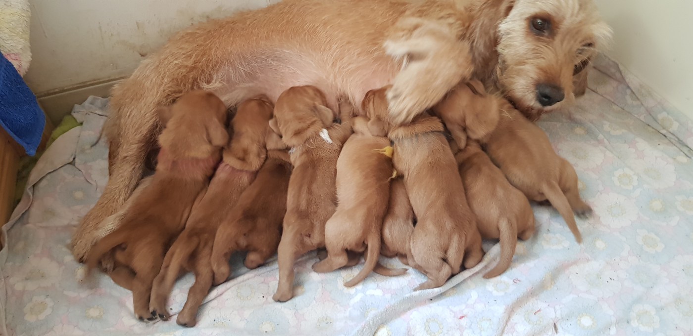 Die Welpen wurden diese Woche das erste Mal entwurmt und die spitzen Krallen geschnitten. Für das Muttertier ein Segen, da es beim Milchtreten von 18 Pfoten doch recht unangenehm wird!