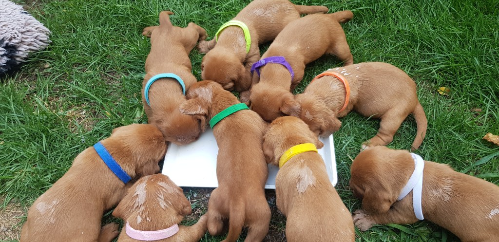 Die Welpen bekommen nun 2x täglich Welpenmilch. Am Ende der Woche waren auch die Fangzähne dann vollständig da. Das Spielen und Kämpfen untereinander wird nun lauter, es zwickt auch sicher ganz toll wenn einen die kleinen Nadeln in die Ohren, den Bauch oder die Pfoten zwicken 😉