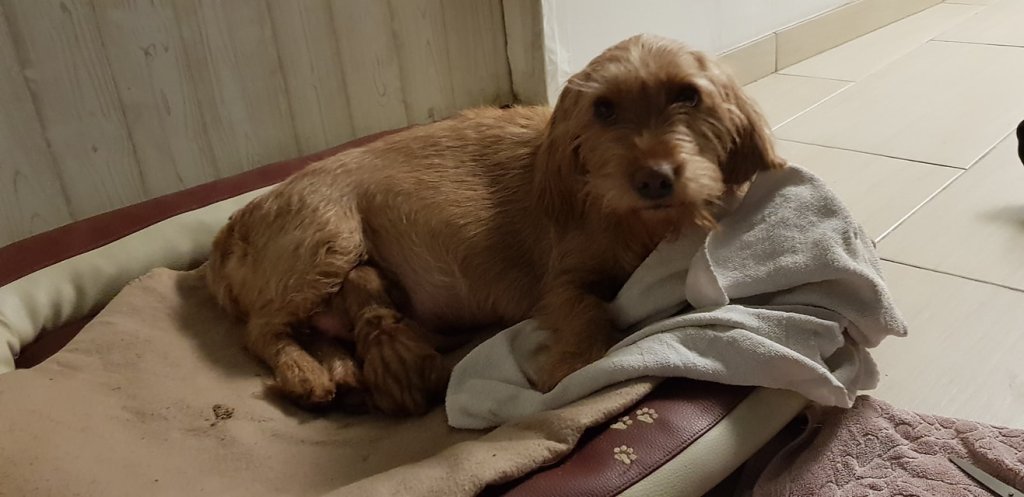 Die Hündin wurde nach einer unkomplizierten Trächtigkeit am 2.1. 2020 nachts sichtlich unruhig. Um 3:00 morgens begann sie mit dem Hecheln, Nesterl graben und umher streifen. Für uns ein Zeichen in den nächsten 24h geht es los. Gesagt getan … fast 24h. starteten die ersten Presswehen.