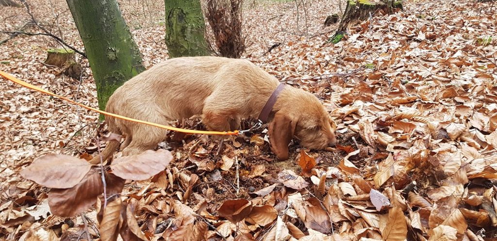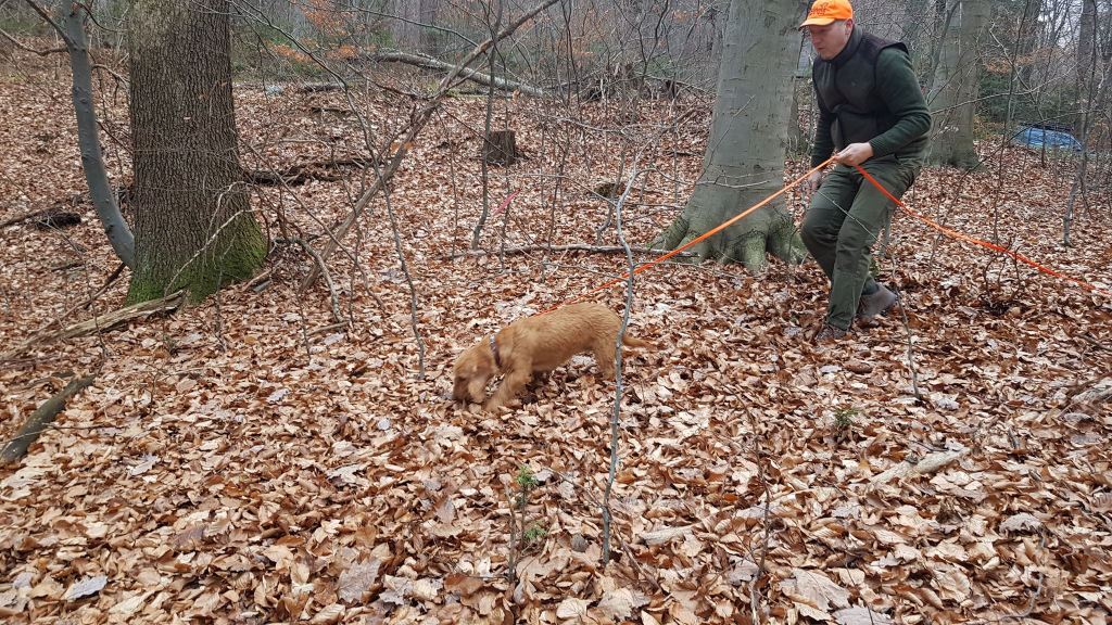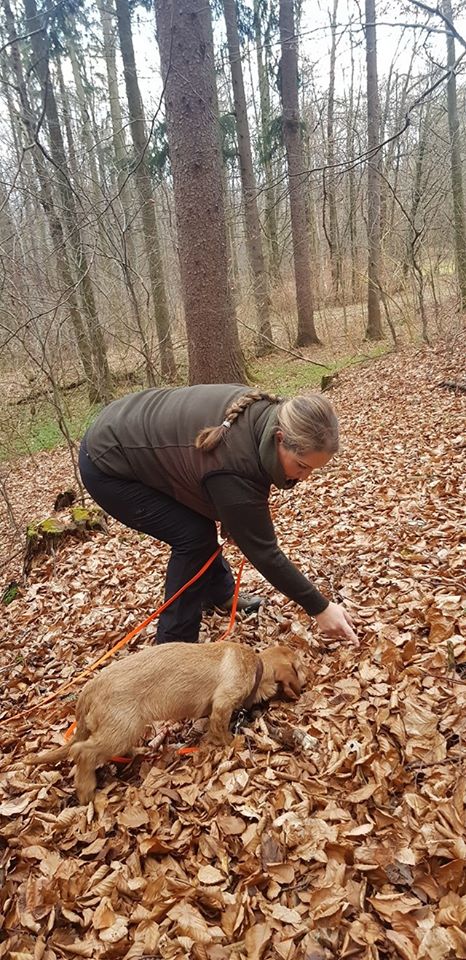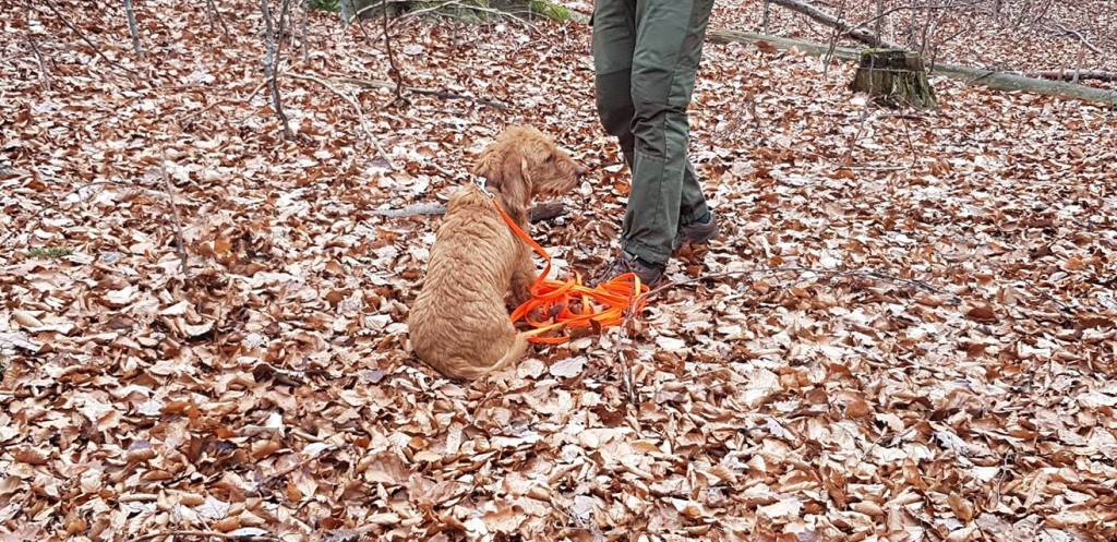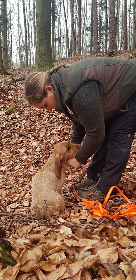 … Fährtenarbeit mit den „Kleinen“ Oriane (die seit der AP im September nicht mehr gearbeitet hatte) und Felice (die überhaupt noch gar keine richtige Fährte gearbeitet hatte).