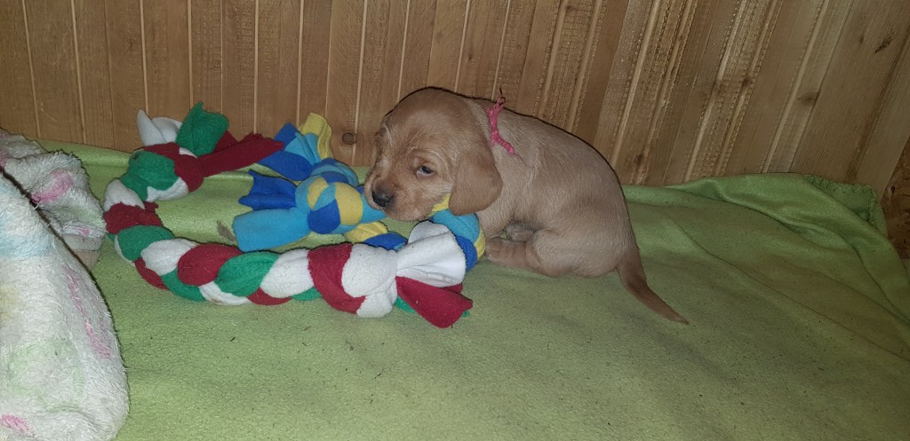 Die Woche 4 ist bis jetzt die belebteste Woche. Die Welpen nehmen ihre Umgebung wahr und kommunizieren miteinander. Sie spielen, knurren, beißen und versuchen zu bellen.