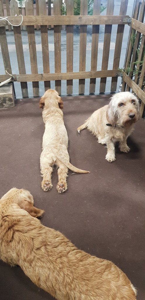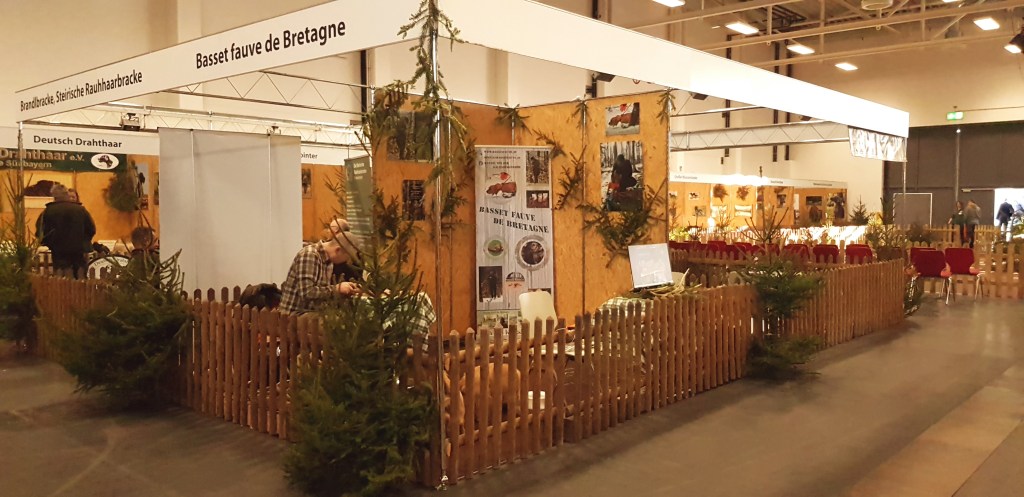 Wir waren TOP ausgerüstet für einen kleinen Messestand und mussten staunen über den Auftritt, den uns die Organisatoren dort ermöglichten. Eine 4x3m Koje, wenn nicht größer, mit Jägerzaun und Deko. Man konnte tolle Gespräche führen und musste sich nicht Sorgen machen, dass die Hunde mal abhauen könnten. Platz ohne Ende für das mitgebrachte Equipent und unsere Hunde.