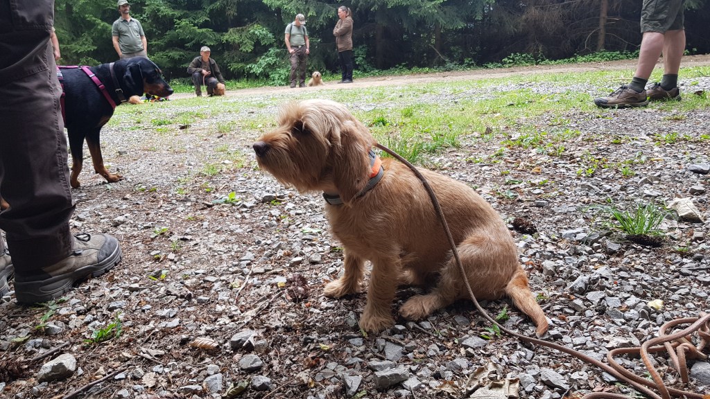Bei der Übung zum Verweisen auf der Fuchsschleppe waren wir mutig. Ohne Riemen sicher zum Stück … nur leider war sogar das versteckte Futter am Ende der Schleppe heute nicht interessant genug, um mich abzuholen. Claire hat die Gegend erkundet und war nach 10 Minuten wieder da.