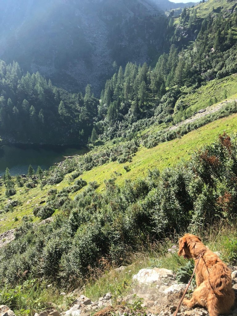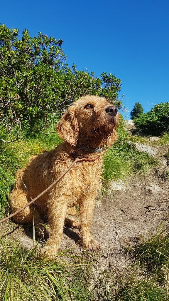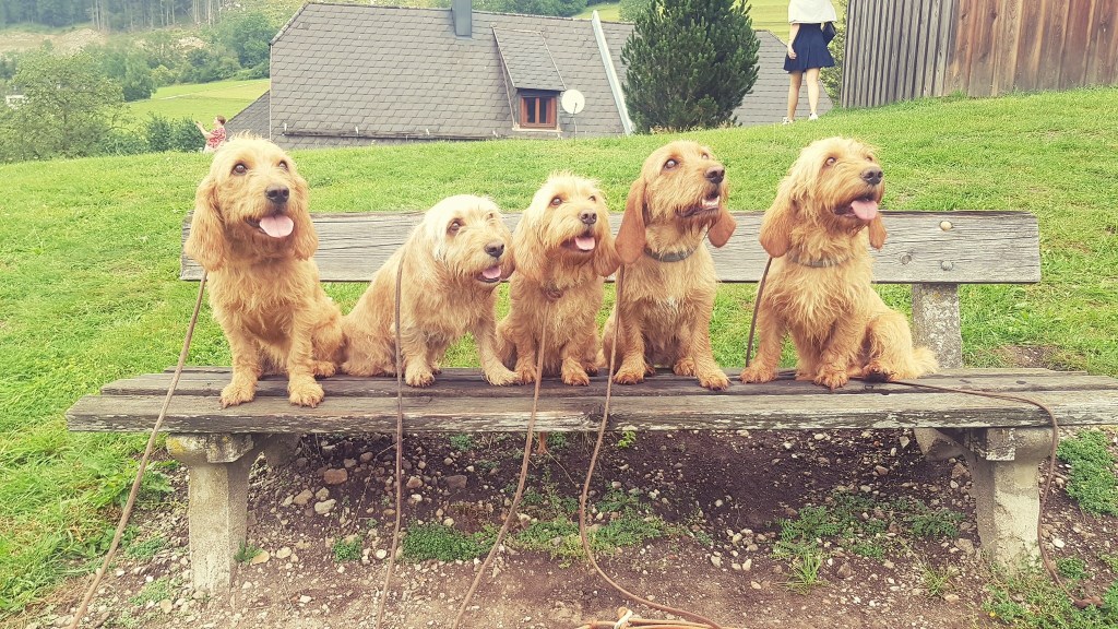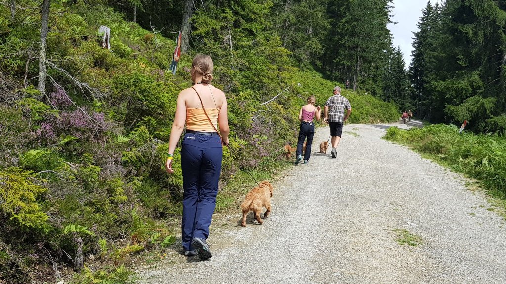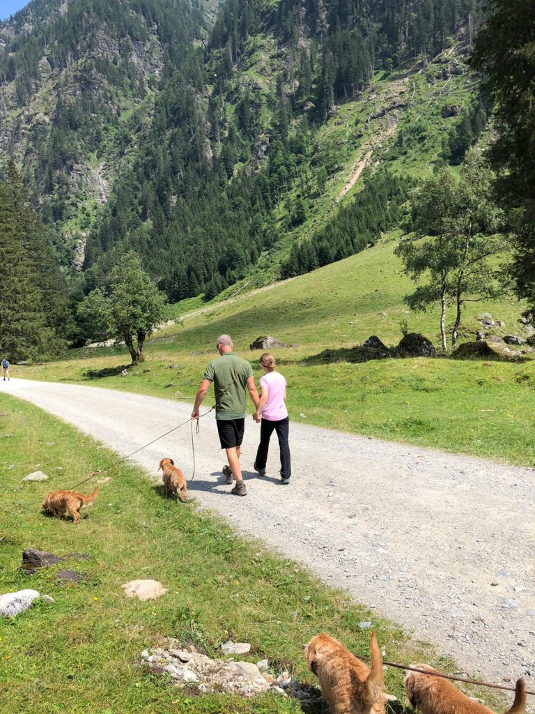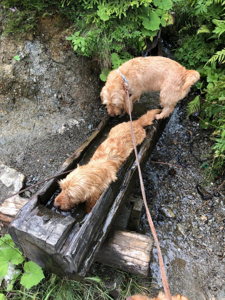 Wandern mit 5 Hunden ist eine Herausforderung, aber es geht. Erleichtert wird es natürlich, wenn die Hunde leinenführig sind und gut erzogen. Dann sind Begegnungen mit Bergziegen, Murmeln oder anderen Hunden am schmalen Steig mit weniger Stress verbunden. Natürlich muss man für zwischendurch an ausreichend Erfrischung für die 4-Beiner denken.