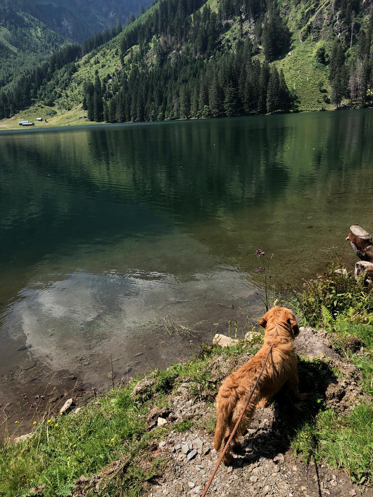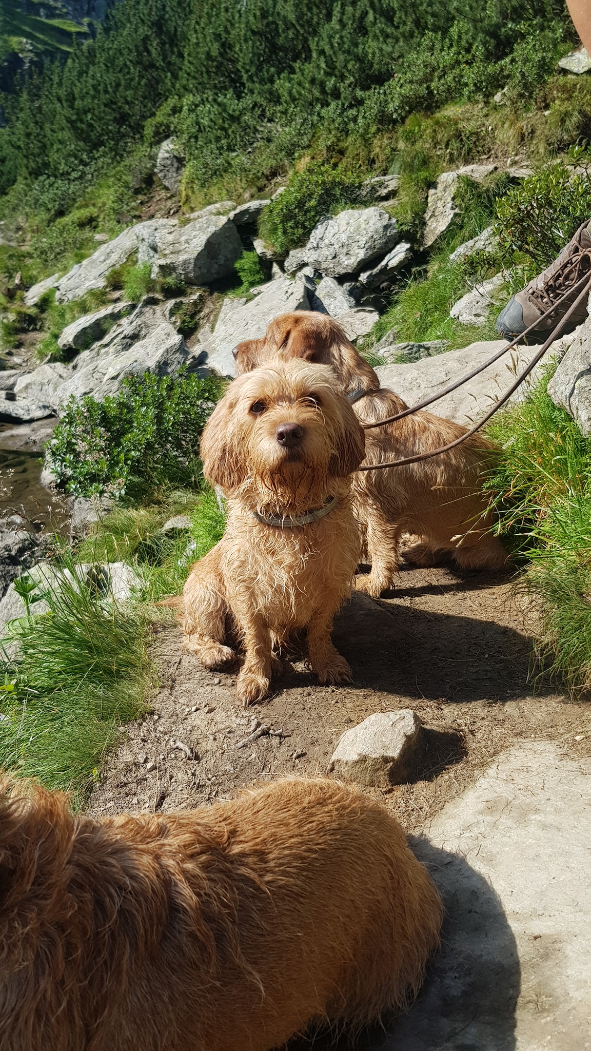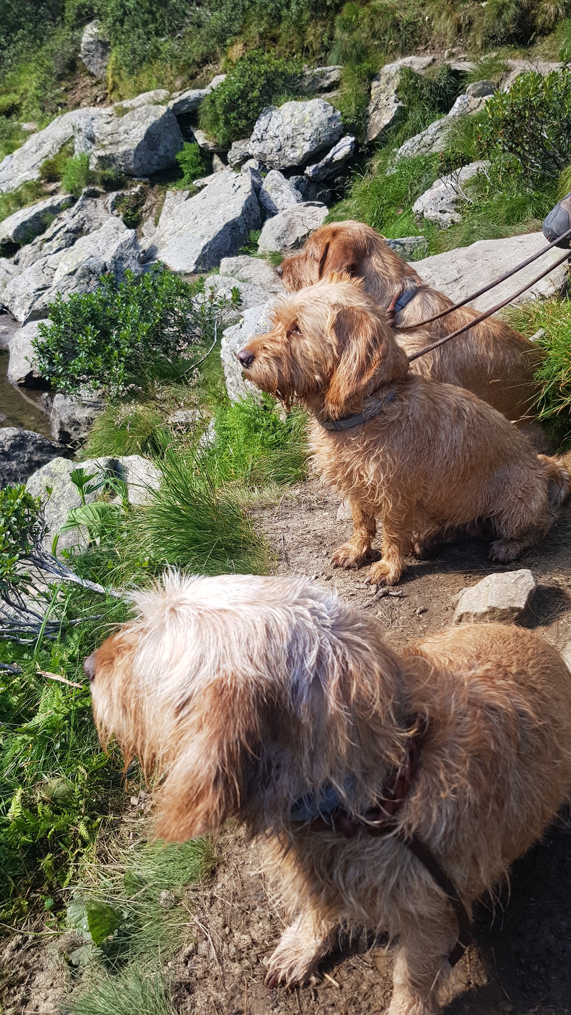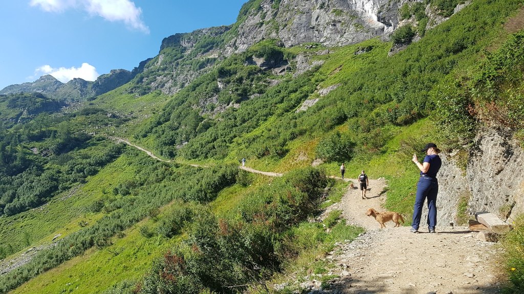Wandern mit 5 Hunden ist eine Herausforderung, aber es geht. Erleichtert wird es natürlich, wenn die Hunde leinenführig sind und gut erzogen. Dann sind Begegnungen mit Bergziegen, Murmeln oder anderen Hunden am schmalen Steig mit weniger Stress verbunden. Natürlich muss man für zwischendurch an ausreichend Erfrischung für die 4-Beiner denken.