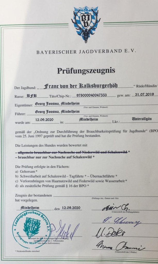 Mit Stolz geben wir bekannt, dass „Frodo“ (Franc v.d. Kalksburgerhöh) die Brauchbarkeitsprüfung zur Nachsuche auf Schalenwild bestanden hat. Herzliche Gratulation!