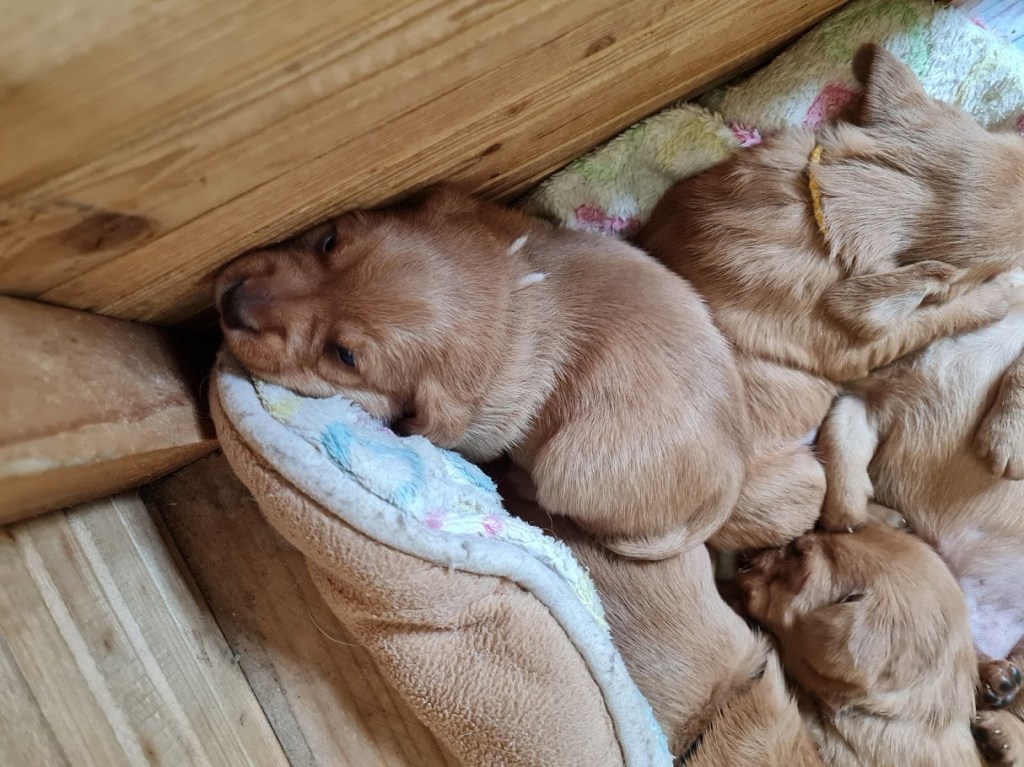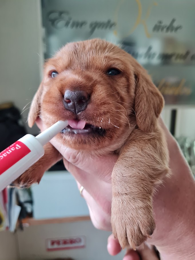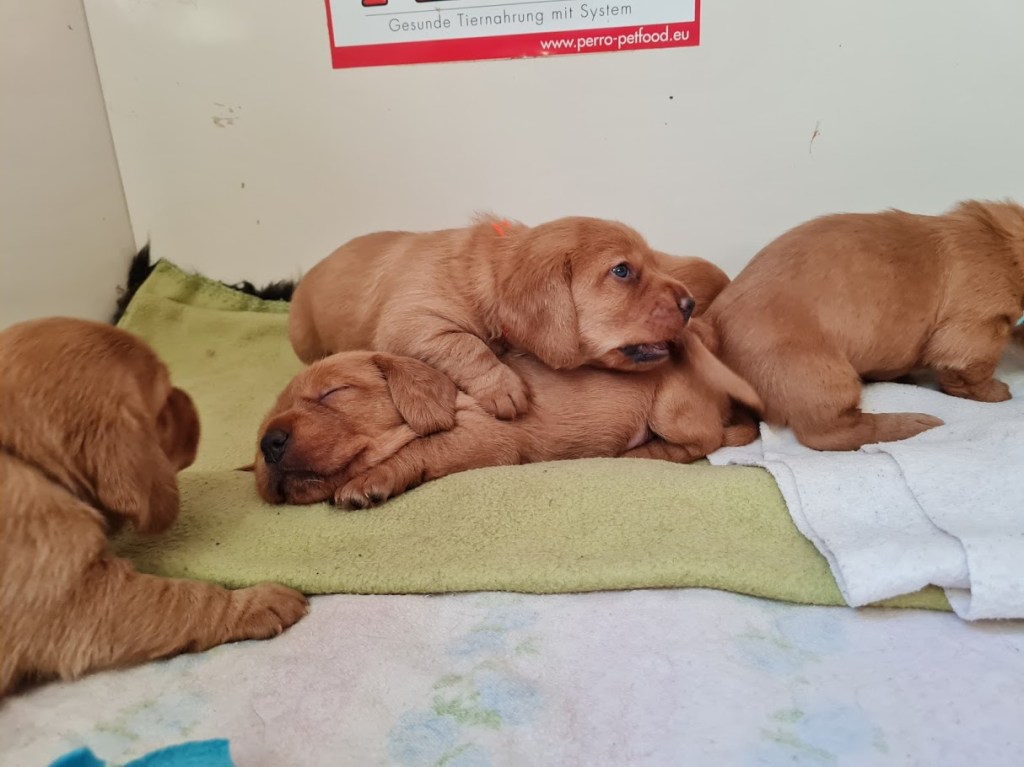 Die Wachphasen werden immer länger und in diesen tummeln wir uns fröhlich in der Wurfbox und laufen im Kreis. Derzeit sind es ca 5 Minuten voller Power und dann fallen wir um und schlafen wieder. Es werden die ersten „Kämpfe“ beobachtet, es wird in Behänge und Ruten gezwickt. Langsam wird das auch schmerzhafter, denn die ersten Beißerchen brechen durch. Wir bellen und knurren auch schon recht laut, der eine oder andere daneben erschrickt dann auch manchmal.