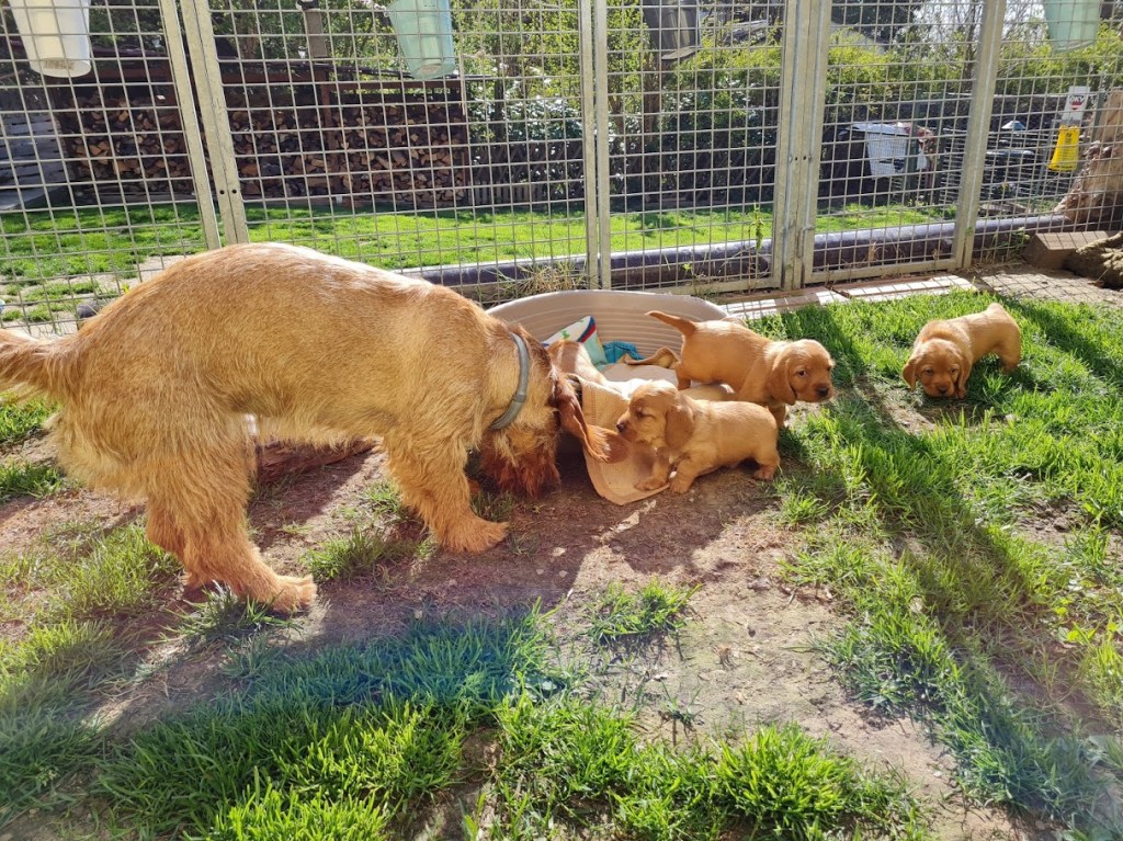 Die anderen Meutemitglieder dürfen nun auch immer öfter die Kleinen kennenlernen und begutachten – allerdings ohne Mutter, sie ist immer noch sehr besitzergreifend. Auch fremde Personen dürfen immer noch nicht unseren Grund betreten, ohne dass sie das furchtbar aufregt. Eine wachsame Mutterhündin – in jedem Fall!