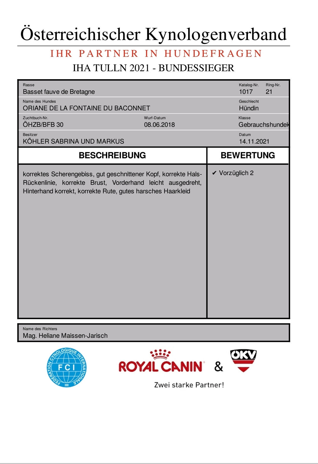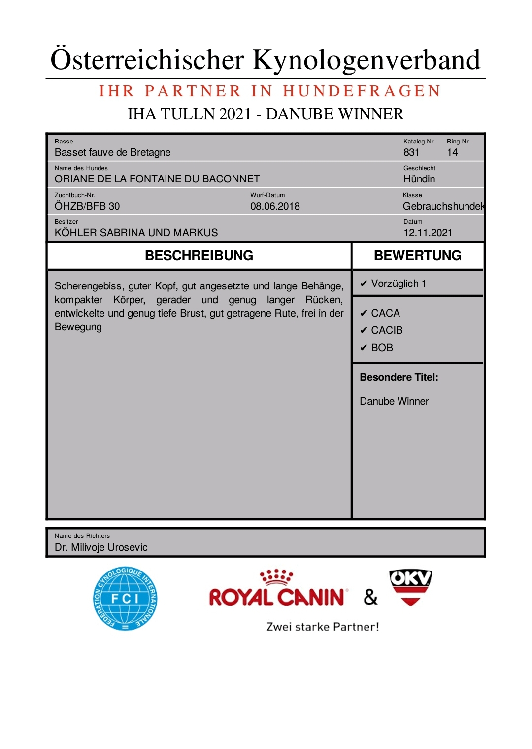 Wir waren mit 𝕱𝖊𝖑𝖎𝖈𝖊 𝖛.𝖉. 𝕶𝖆𝖑𝖐𝖘𝖇𝖚𝖗𝖌𝖊𝖗𝖍ö𝖍 und 𝕺𝖗𝖎𝖆𝖓𝖊 𝖉𝖊 𝖑𝖆 𝕱𝖔𝖓𝖙𝖆𝖎𝖓𝖊 𝖉𝖚 𝕭𝖆𝖈𝖔𝖓𝖓𝖊𝖙 auf der internationalen #hundeausstellung in Tulln, um unsere #formwerte für die Zucht zu vervollständigen. Wir sind sehr zufrieden mit den Ergebnissen und Beschreibungen der Richter.