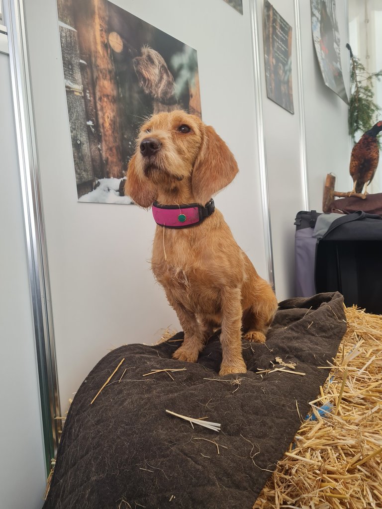 dem interessierten Publikum. Noch war nicht die Hölle los bei den Hunderassen, wir schieben es auf den neuen, versteckten Standplatz der Kojen. Als Einstand war es schon recht angenehm, weil man auch Zeit hatte für jedes Gespräch. Um 14 Uhr stellte Frau Elena Loderer bei der Rassehundepräsentation professionell die einzelnen Hunderassen vor. Wir freuen uns auf zwei weitere Messetage, die strahlenden Sonnenschein versprechen. Weidmannsheil