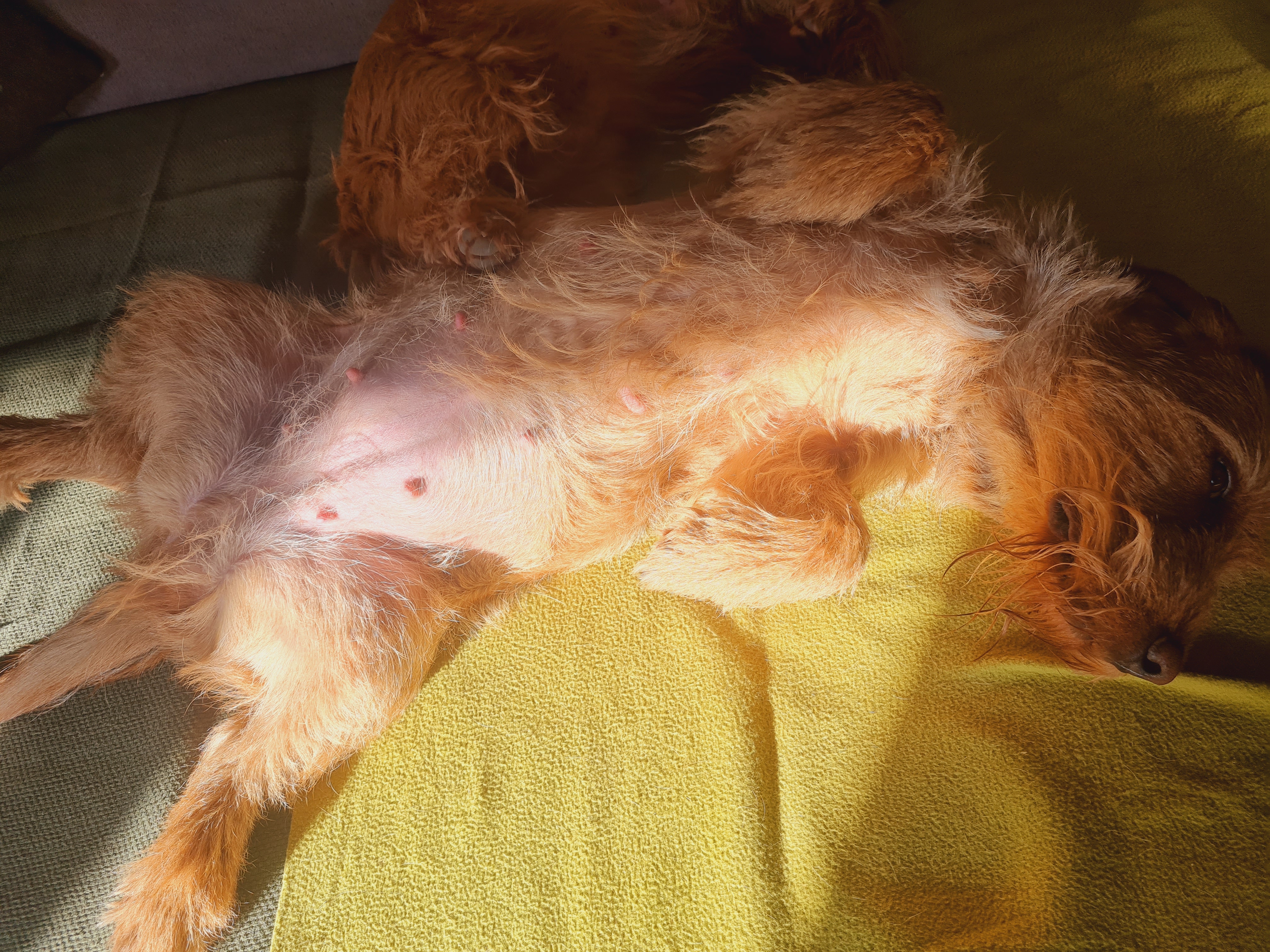 Felice nimmt es gelassen und ist meist faul am Brüten, manchmal tollt sie aber auch im Garten rum, als wäre nichts. Naja trächtig sein, ist ja auch keine Krankheit ☝🤣 Nachdem der Appetit in Woche 3 und 4 eher mäßig war und sie wohl Probleme mit Morgenübelkeit plagten, nimmt der Hunger nun täglich zu.