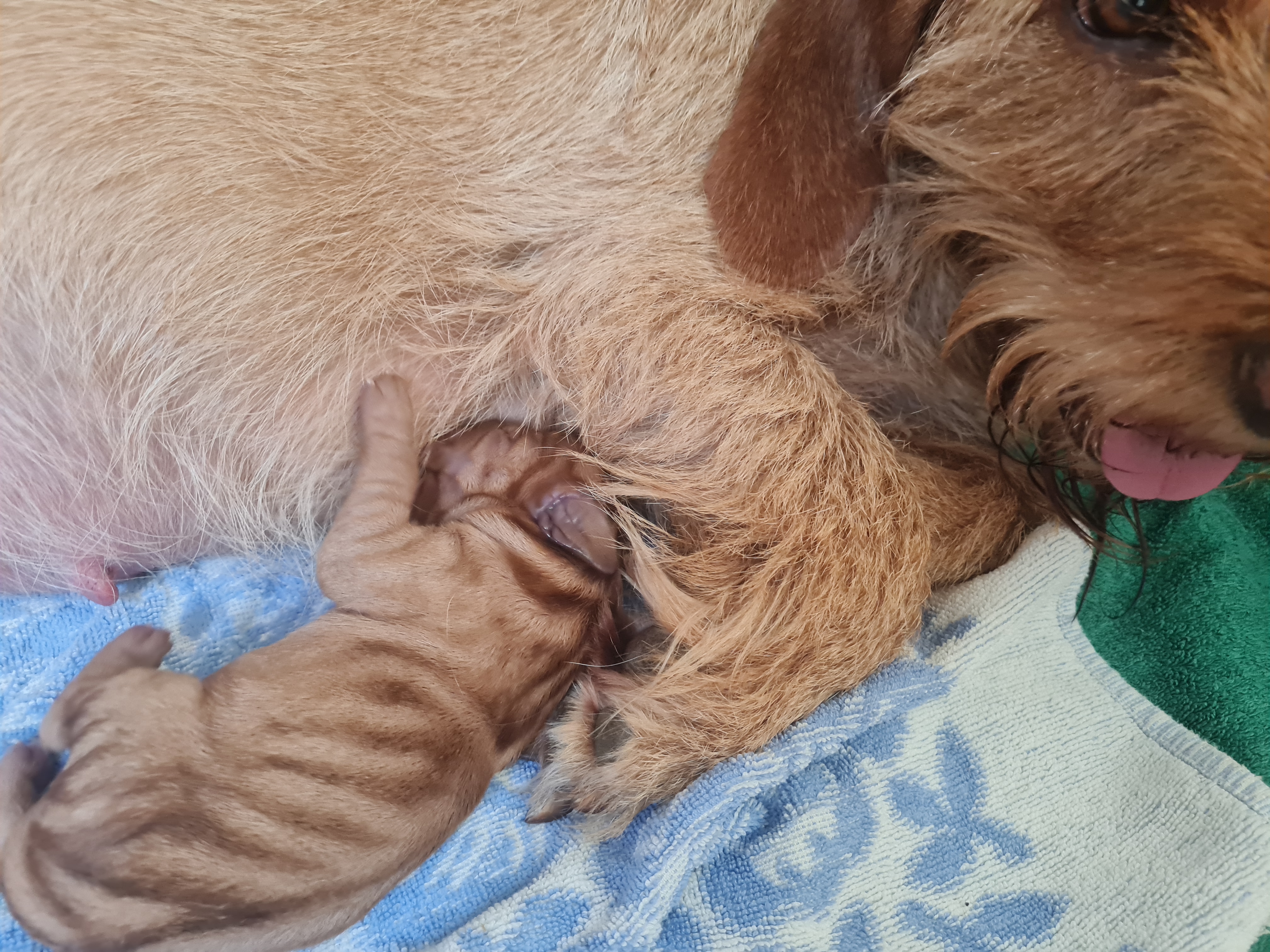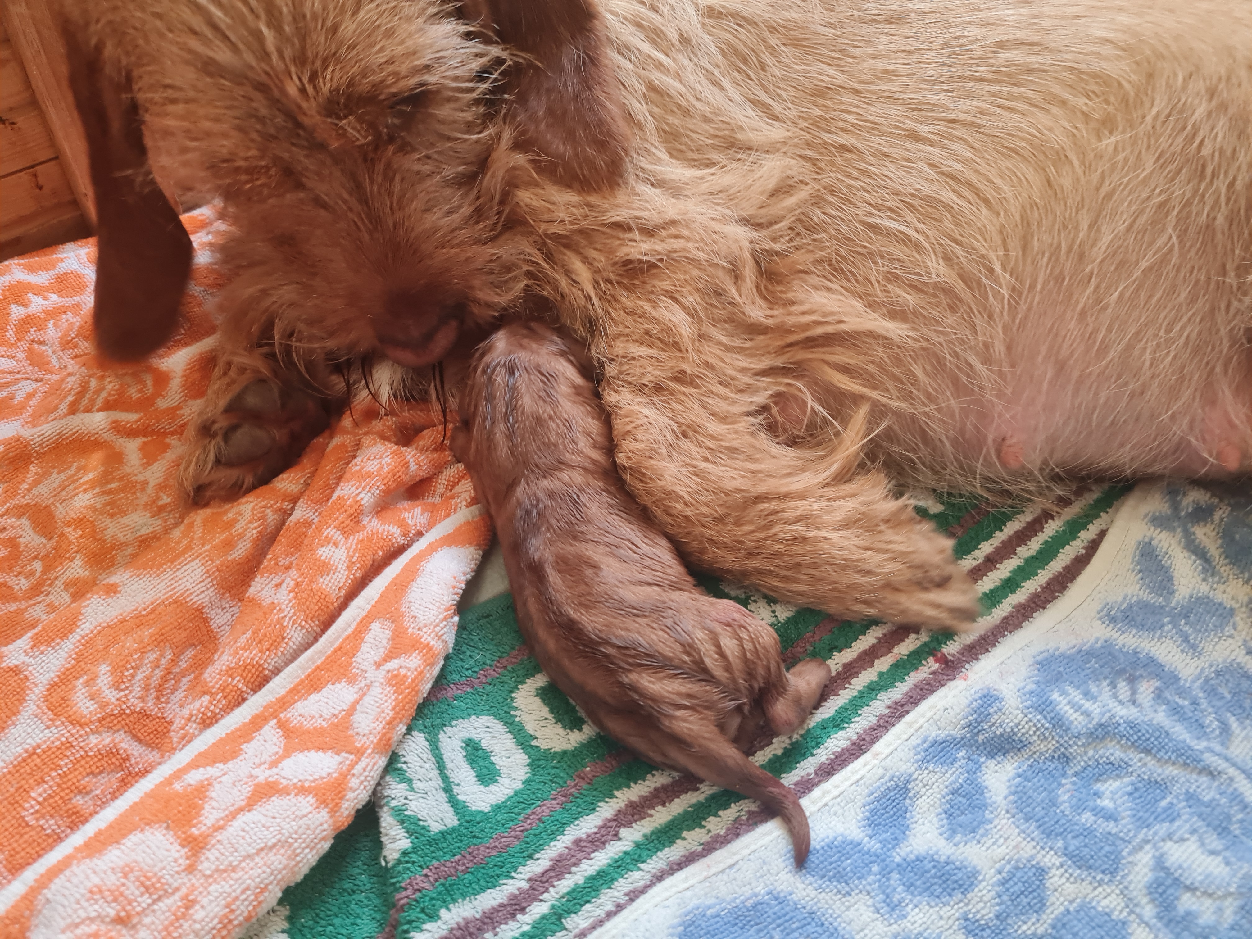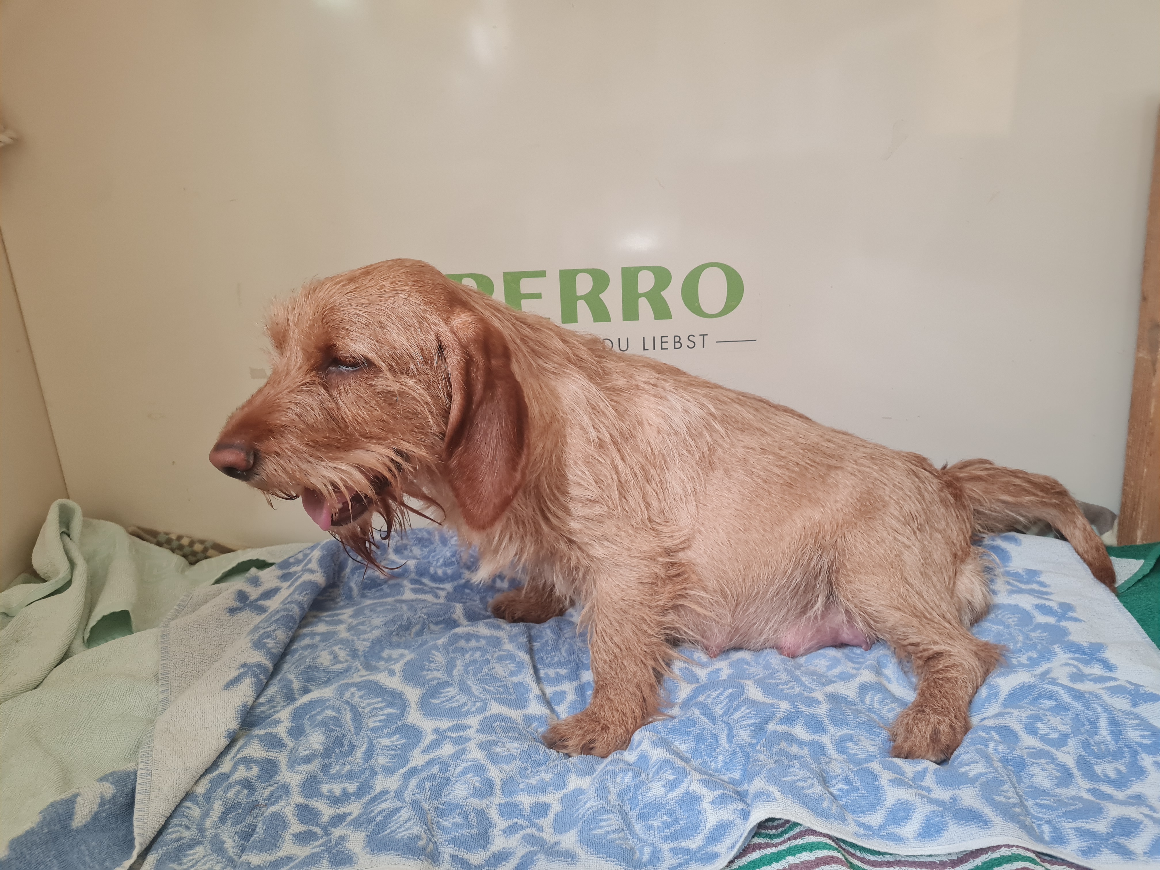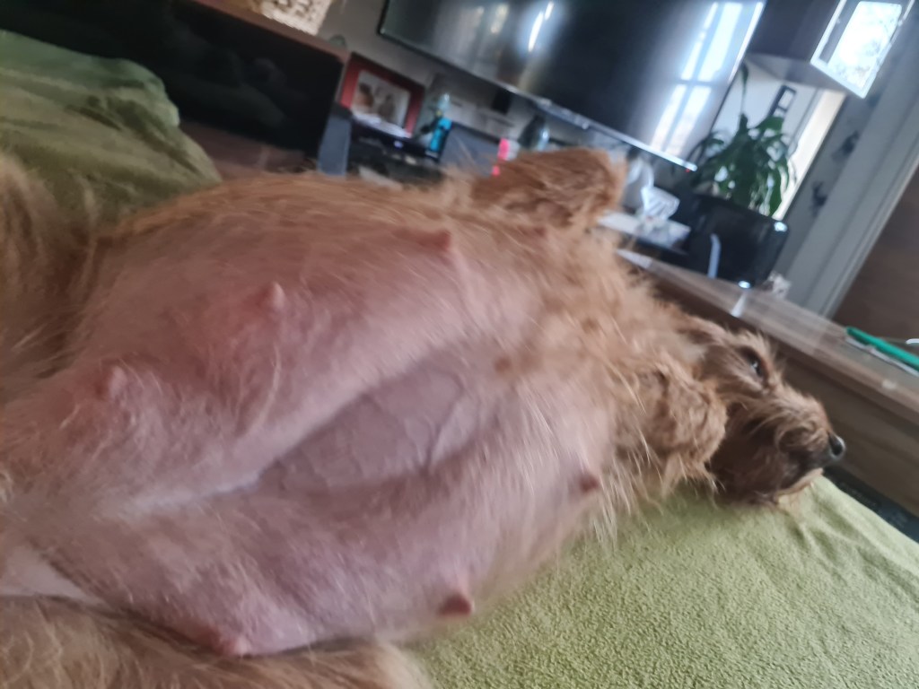 Die Eröffnungsphase dauert zwischen 6 und 36 Stunden. Wir sind am 58. Tag – normale Tragezeit sind 62-63 Tage, aber ab dem 57. Tag kann die Geburt starten. Eigentlich wollten wir heute mit dem Fieber messen starten, aber das können wir uns wahrscheinlich sparen. Vor der Geburt sinkt die Temperatur der Hündin um einen Grad.