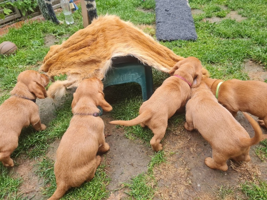 Den Rehlauf finden wir immer noch sehr toll. Aber diese Woche kam noch eine Entenschwinge dazu. Manche von uns verwenden schon die Nase und gehen lieber der Schleppspur nach, als auf Sicht zu jagen. Am besten fanden wir bis dato die Rehdecke. Sie hat sich bewegt und riecht ganz furchtbar interessant, man kann auch super die Haare ausrupfen – hat Frauchen nicht so toll gefunden.
