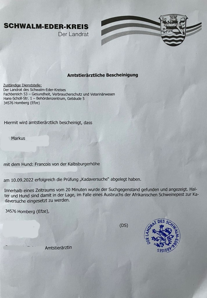 Voller Stolz als Züchter möchten wir bekannt geben, dass Francois v.d. Kalksburgerhöh aka „Ferdi“ heute die Prüfung geschafft und den Nachweis zum ASP Kadaversuchhund erbracht hat.