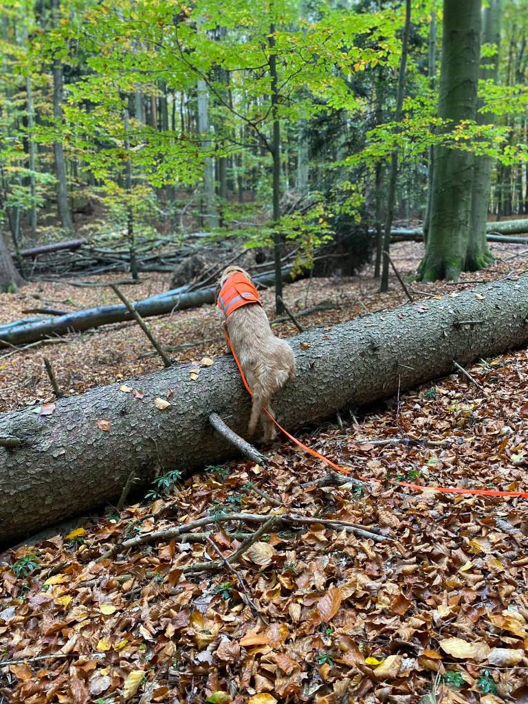 Bei der Kontrolle der Kirrungen und Kameras kann man dann auch Übungen wie das Ablegen einbauen, welche nicht sehr beliebt sind, aber absolut von Nöten.