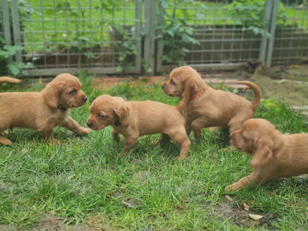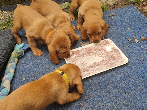 Der Tagesablauf ist ausgerichtet auf Schlafen und Spielen. Man merkt, der Energiebedarf wird höher – die Lust der Mutter zu säugen wird kleiner. Deswegen startet nun das zufüttern. Erst langsam 1x pro Tag mit etwas Dosenfleisch und Welpenmilch. Dies wird im Laufe der nächsten 2 Wochen gesteigert auf erst 2x täglich, dann auf 3x täglich. Dazu kommen Flocken oder stattdessen rohes Rehfaschiertes, dazwischen auch mal aufgeweichte Kroketten – Trockenfutter. Abwechselnd werden die Welpenbäuchlein an feste Nahrung aller Art gewöhnt. Somit beschränkt sich das Säugen tatsächlich auf morgens und abends.