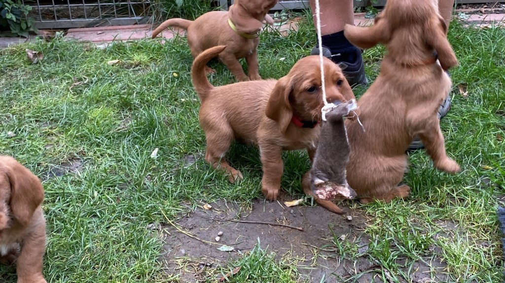 In der Woche 6, wenn wir das rohe Fleisch vertragen haben, dann kommt die erste Gewöhnung an Wild. Wir starten langsam mit Schwinge und Lauscher. Einfach nur um mal an die Bewegung, den Duft und den Geschmack von Haaren oder Federn zu gewöhnen.