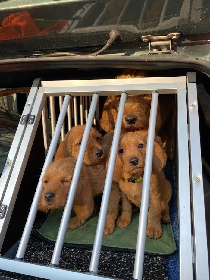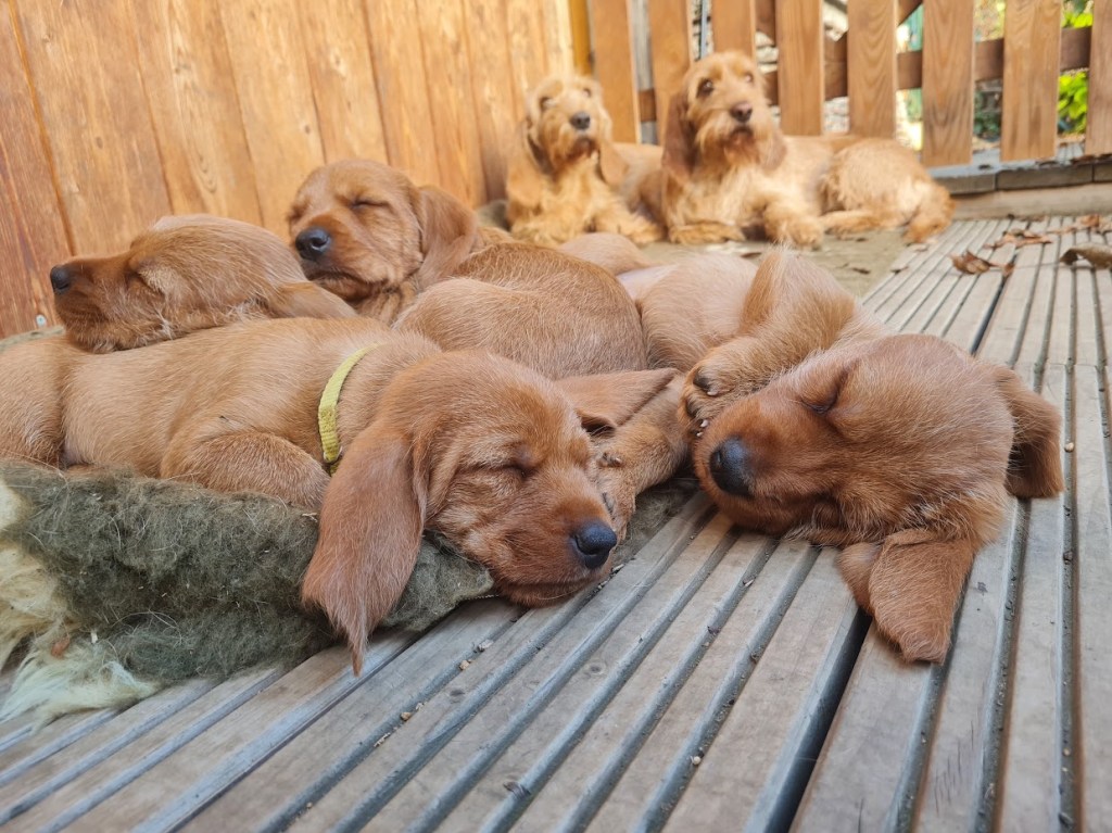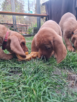 Am Ende der Woche haben wir die erste Futterschleppe gemacht. Anfangs etwas holprig und abgelenkt, haben wir schnell kapiert worum es geht und haben die Schleppe gut ausgearbeitet. Für so kleine Jagdhunde eine passable Leistung. Die Woche aberundet haben erneutes Nägelschneiden, eine Wurmkur und der erste Besuch im Wohnzimmer der Zweibeiner … denn JA, auch Fliesenboden muss man kennenlernen, die Couch besichtigen und Kabel, Türen und Teppiche kennenlernen.