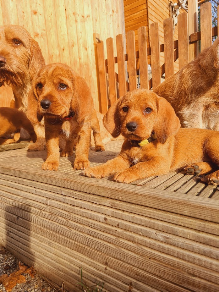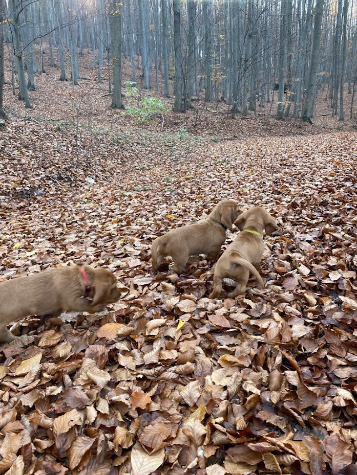 Das nächste Abenteuer war der Reviergang mit Mama Oriane und Tante Felice. Wir durften Autofahren, was wir anfangs nicht so toll fanden, aber man hat sich schnell daran gewöhnt. Danach konnten wir uns im Herbstwald austoben in den Blätterbergen. Wir haben auch den einen oder anderen Rehwechsel gefunden und sind nachgegangen.