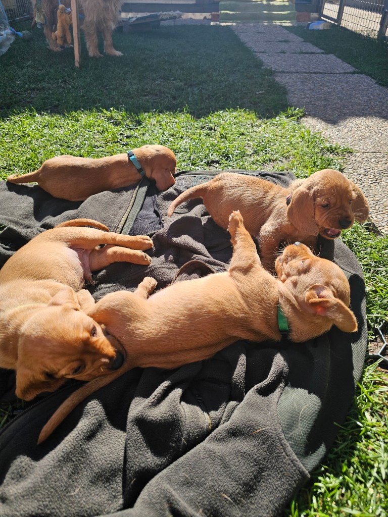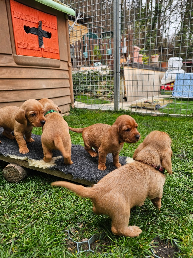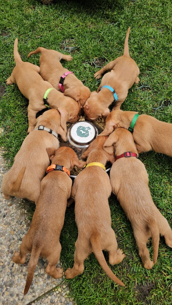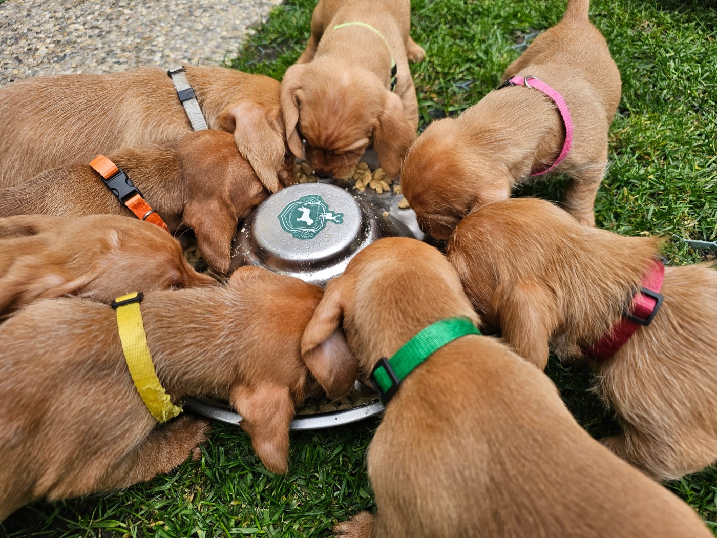 Eingeweichtes Trockenfutter ist für die Welpen der perfekte Start zum zufüttern. Das erste Futter ist immer ein Highlight. Die fetten Babybäuche danach zuckersüß zum ansehen. Ein paar Tage lang haben wir 1x pro Tag gefüttert, meistens morgens. Sukzessive haben wir das bis zum Ende der Woche auf 2x erhöht. Der Speiseplan wurde dann auch durch Dosenfutter (Feuchtfutter) erweitert. Die Welpen haben beide Futterarten super vertragen. Nach jedem Festfutter kommt noch die Mama und lässt einen kleinen Milchsnack zu. Die Zufütterung bringt aber auch, dass die Verlassenschaften nicht mehr von Mama verräumt werden … das heißt ein Paar Häufchen pro Tag wollen gesucht und gefunden werden!
