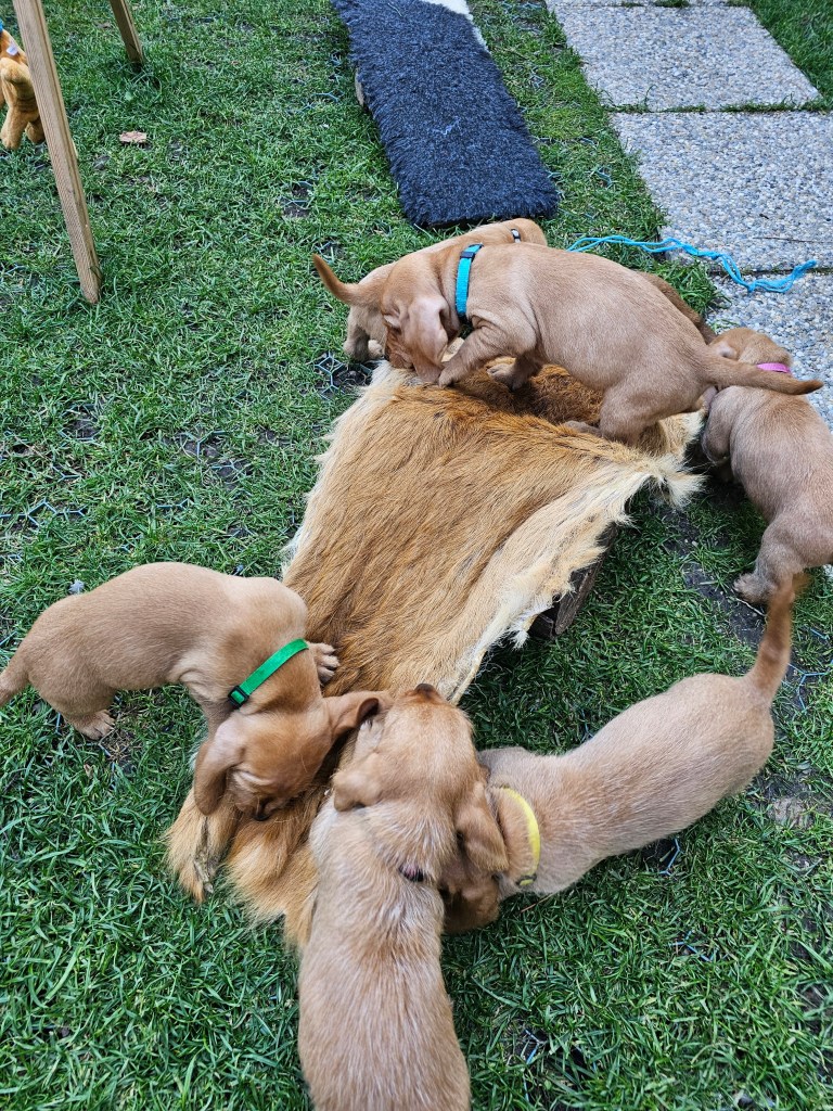 Die Rangkämpfe werden stärker und ernster, die kleinen Charakterköpfe stellen sich auf die Beine und verteidigen ihren Standpunkt. Spielen, entdecken und die Umwelt erkunden stehen an der Tagesordnung. Die Welpen wollen aber auch gefordert werden und neben den „normalen“ Spieleinheiten gibt es auch 1x pro Tag einen Kontakt mit Wild. In Woche 7 kam die getrocknete Rehdecke zum Einsatz. Sie wurde beschnuppert, bestiegen und einige haben versucht die Beute in Sicherheit zu bringen.