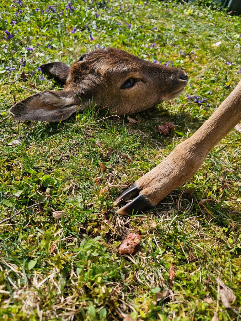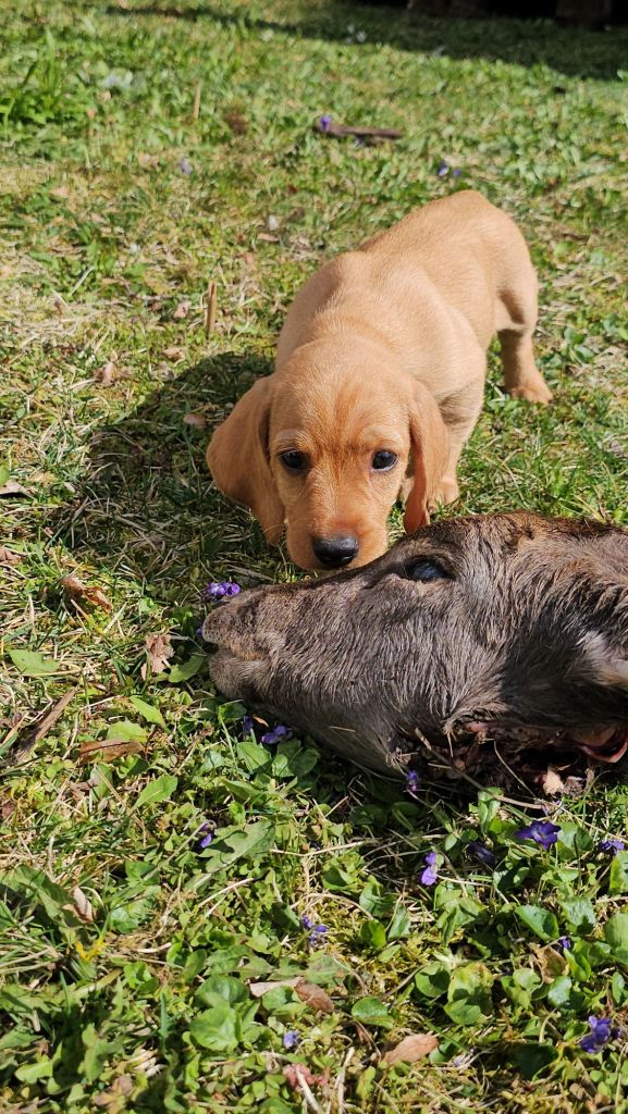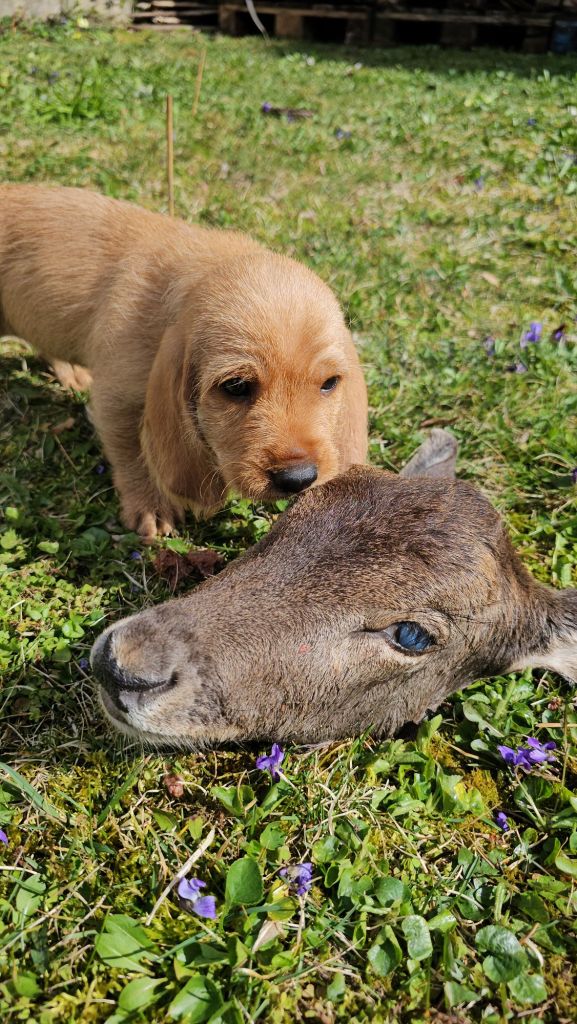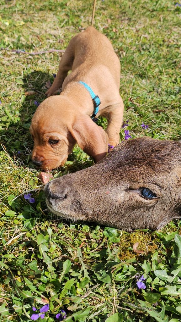 Nun war nicht nur das Einsetzten der Nasen auf der Futterschleppe neu für die Welpen, sondern auch der Duft von Rehfährte. Am Ende der Mini Fährte lag neben einer Futterbelohnung auch ein Rehhaupt.