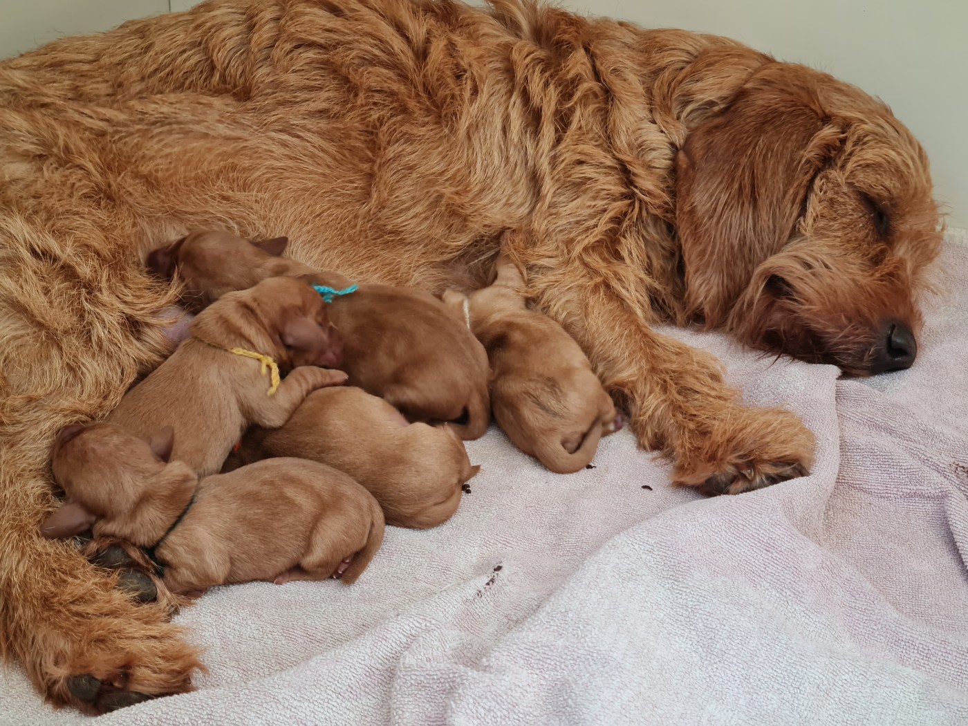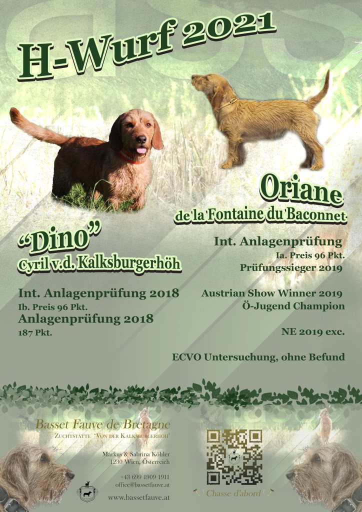 In der Nacht zum 30. März 2021 hat unsere Hündin Oriane de la Fontaine du Baconnet nach dem Rüden Cyril v.d. Kalksburgerhöh aka „Dino“ fünf gesunde Welpen (4/1) gewölft. Die Welpen haben zwischen 234g und 363g und säugen selbstständig.